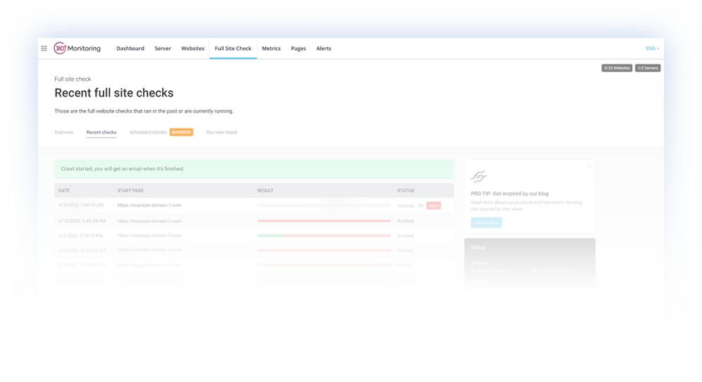 Full Site Check protects your online presence against errors. It crawls your entire website or online store and identifies dead links, broken images, JavaScript errors, and many more anomalies, helping avoid website issues.